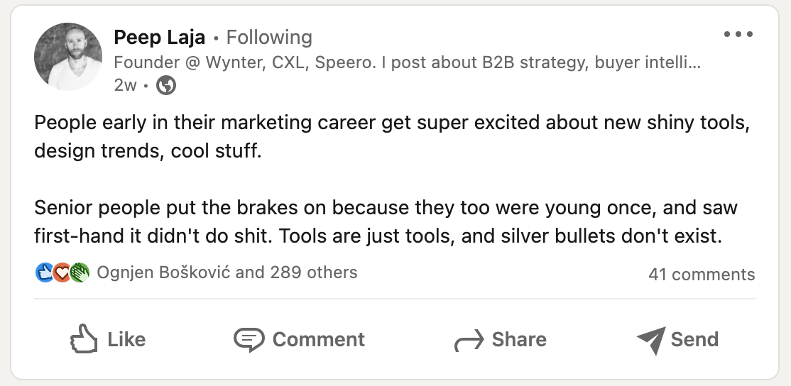 Peep Laja tweeted something similar recently as well: